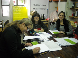 Recibimos en la Biblioteca la visita de los alumnos de 4to, 5to y 6to de la Escuela Nº 5. Un fructífero encuentro en el que los niños y sus maestras escucharon muy atentamente un audiolibro basado en el cuento de "Aladino y la lámpara maravillosa". Además investigaron los libros de cuentos elaborados para baja visión y los escritos en braille con texturas. Por último hicimos una demostración con la ayuda de la docente Lorena Muda sobre las herramientas (maquina de escribir Perkins, tablilla y punzón, hojas manila) a partir de las cuales se lleva a cabo la escritura en braille. A pesar del clima que no acompañó, los chicos se retiraron muy contentos al igual que nosotros por haberlos acercado hacia un lenguaje desconocido pero a la vez tan cercano a ellos. Muchas gracias por la visita y ¡los esperamos nuevamente en otra oportunidad!